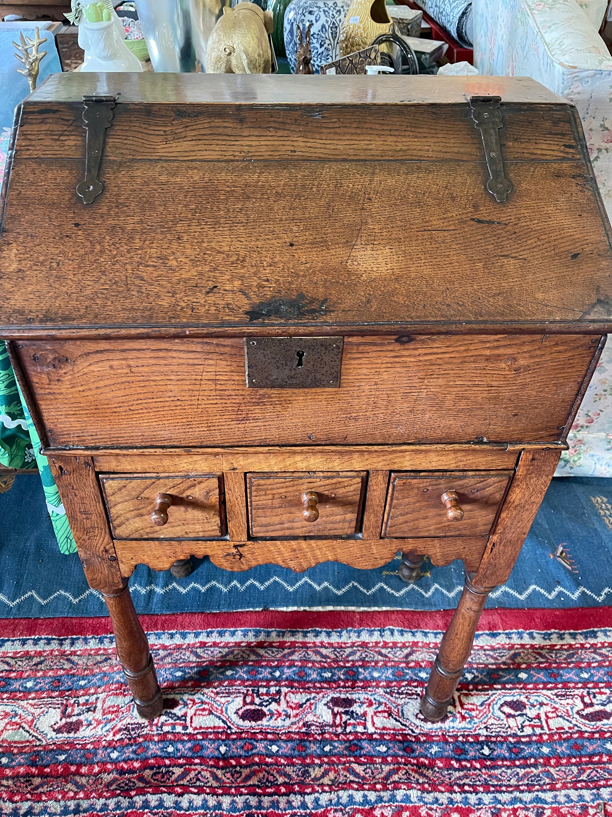 Unique 18th century oak bible box or desk with a sensational patina. Hinged desk, three sweet little storage boxes and a very pretty scalloped edging below. Inside the desk there are two more drawers to store precious things. have never seen a piece like this before. In excellent condition and ready for its new home.