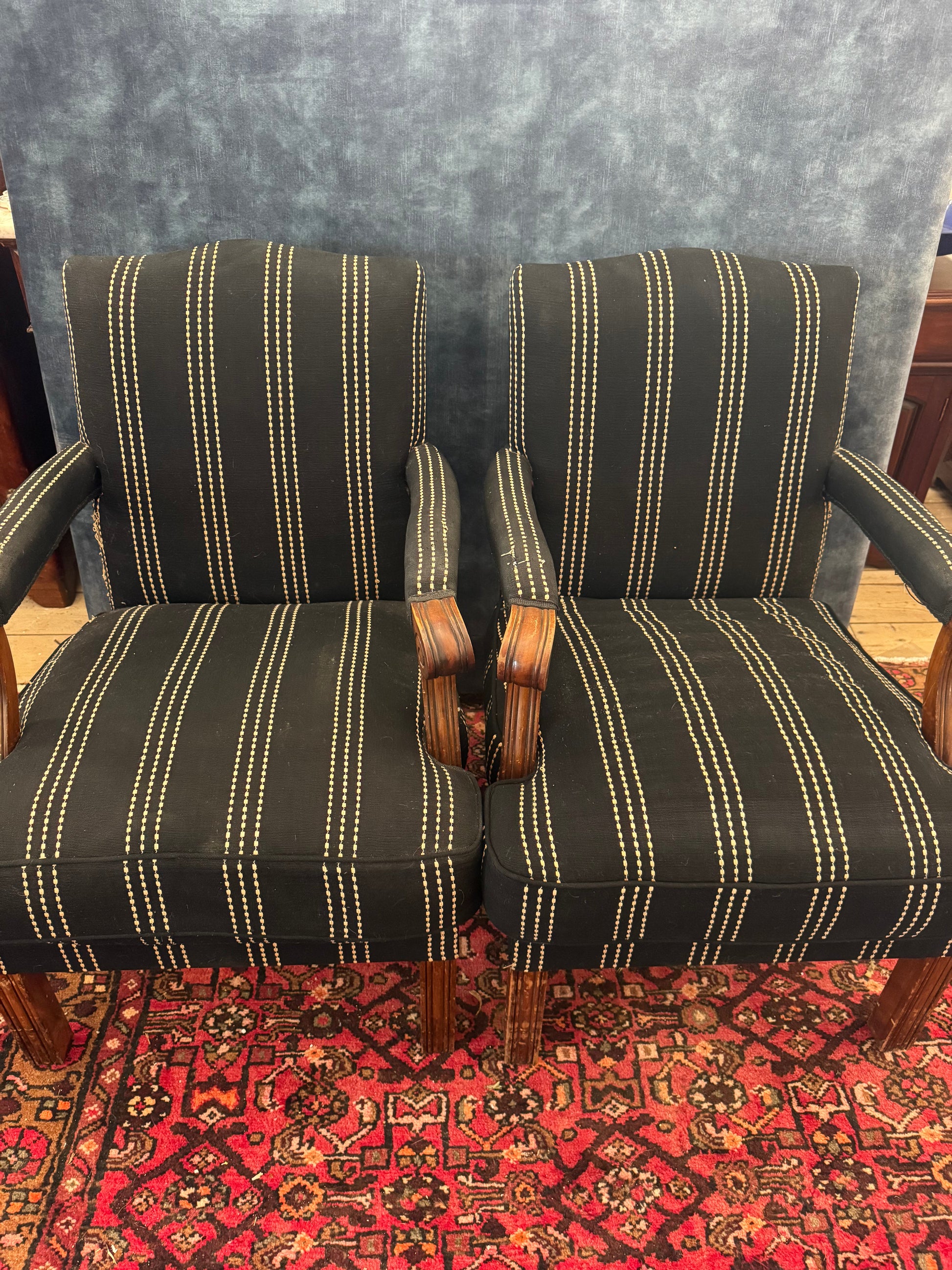 A pair of antique mahogany framed chairs covered in black upholstery fabric with beige stripes. A bit work in some places leave as is or recover with your favourite fabric for a fresh new look!