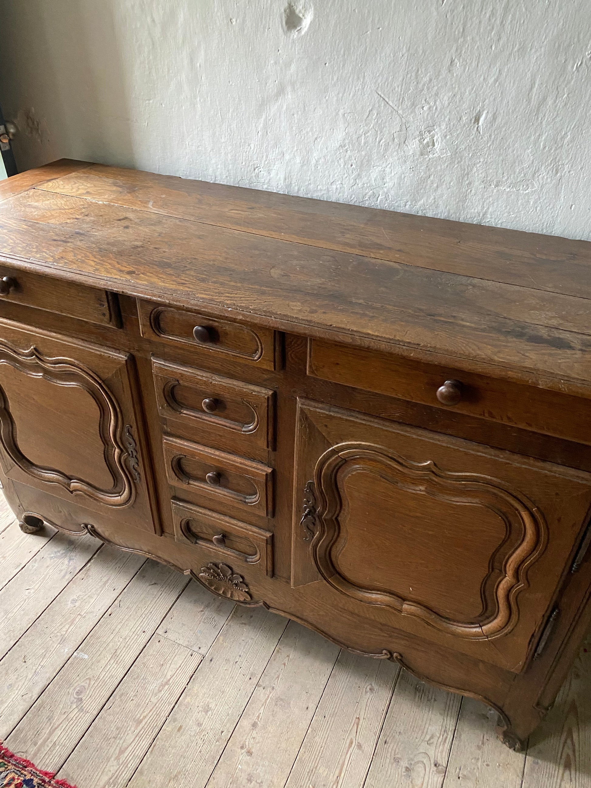 Magnificent solid oak buffet with two drawers and one shelf underneath. It has the most amazing time worn patina and is as heavy as an ox. Inject some warmth and soul into your house with this antique piece. It is over 100 years old and is sure to last another 100 years. Hand built by craftsmen in France.