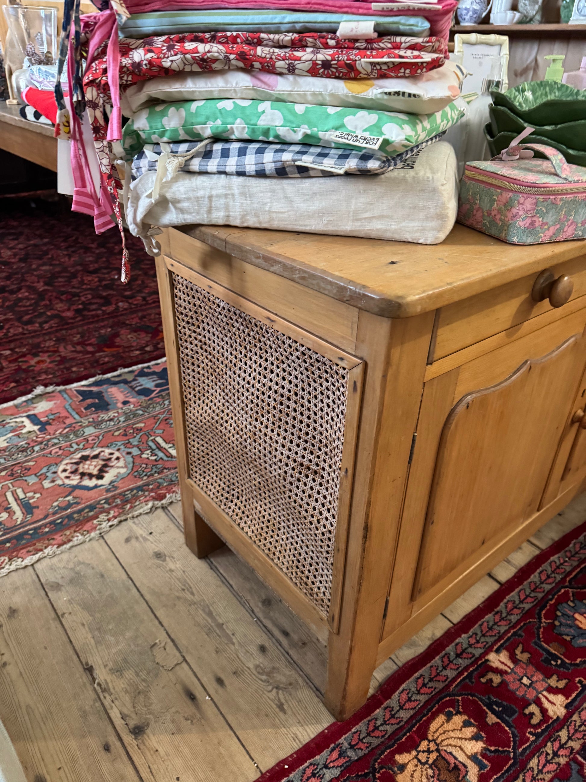 Lovely old Baltic pine, shield door cupboard. The gorgeous honey tones of the pine add warmth to a space. The rattan side panels are a bit out of shape so could be re stretched or replaced with new rattan, glass or wire. This would be a great addition to a kitchen or living room.