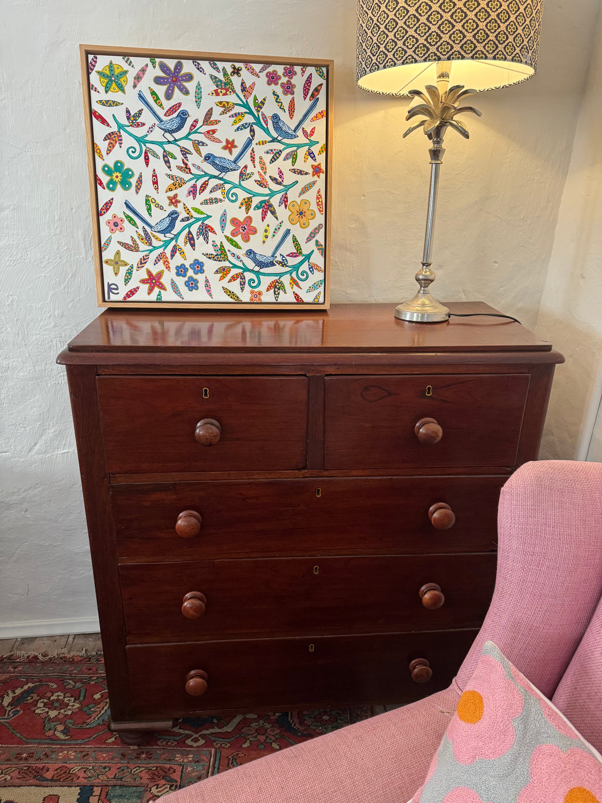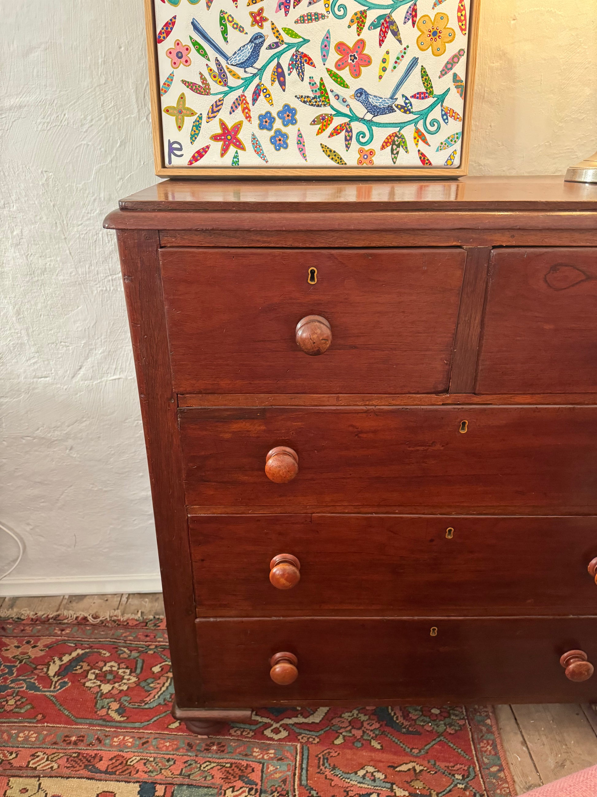 A beautifully restored cedar chest of drawers sitting on bun feet. All drawers glide in and out with ease. Brass escutcheons on each drawer but no keys. Bring style and sophistication to your bedroom or any room with these stunning antique drawers. Bound to outlive modern day furniture and will stand the test of time.