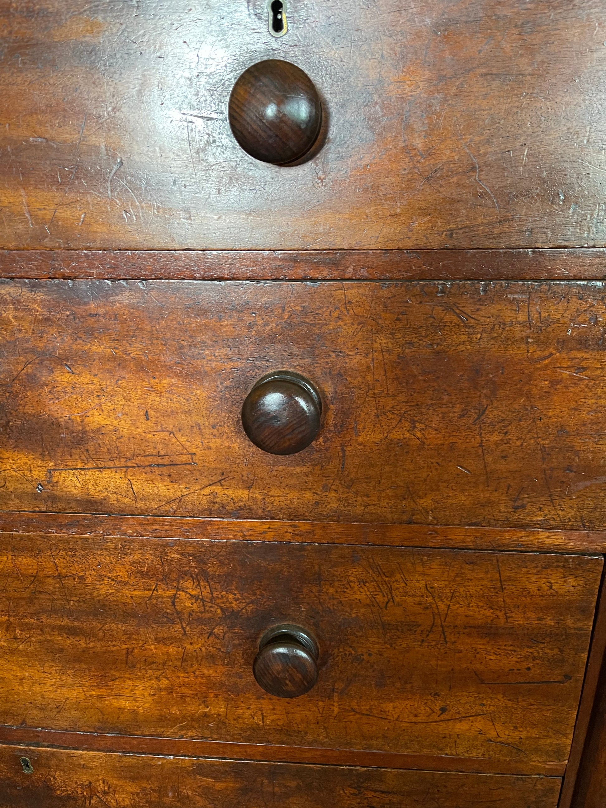 Tall, dark and handsome. A gorgeous piece with a lot of presence! 19th century chest of 5 drawers with strip column decoration, sitting upon bun feet. Absolutely stunning colours present in the cedar and a magical, time worn patina. This piece is in excellent condition for its age. They don’t make pieces of furniture like this anymore. Made by craftsmen using dove tail joins, not staples and nails and tacks!