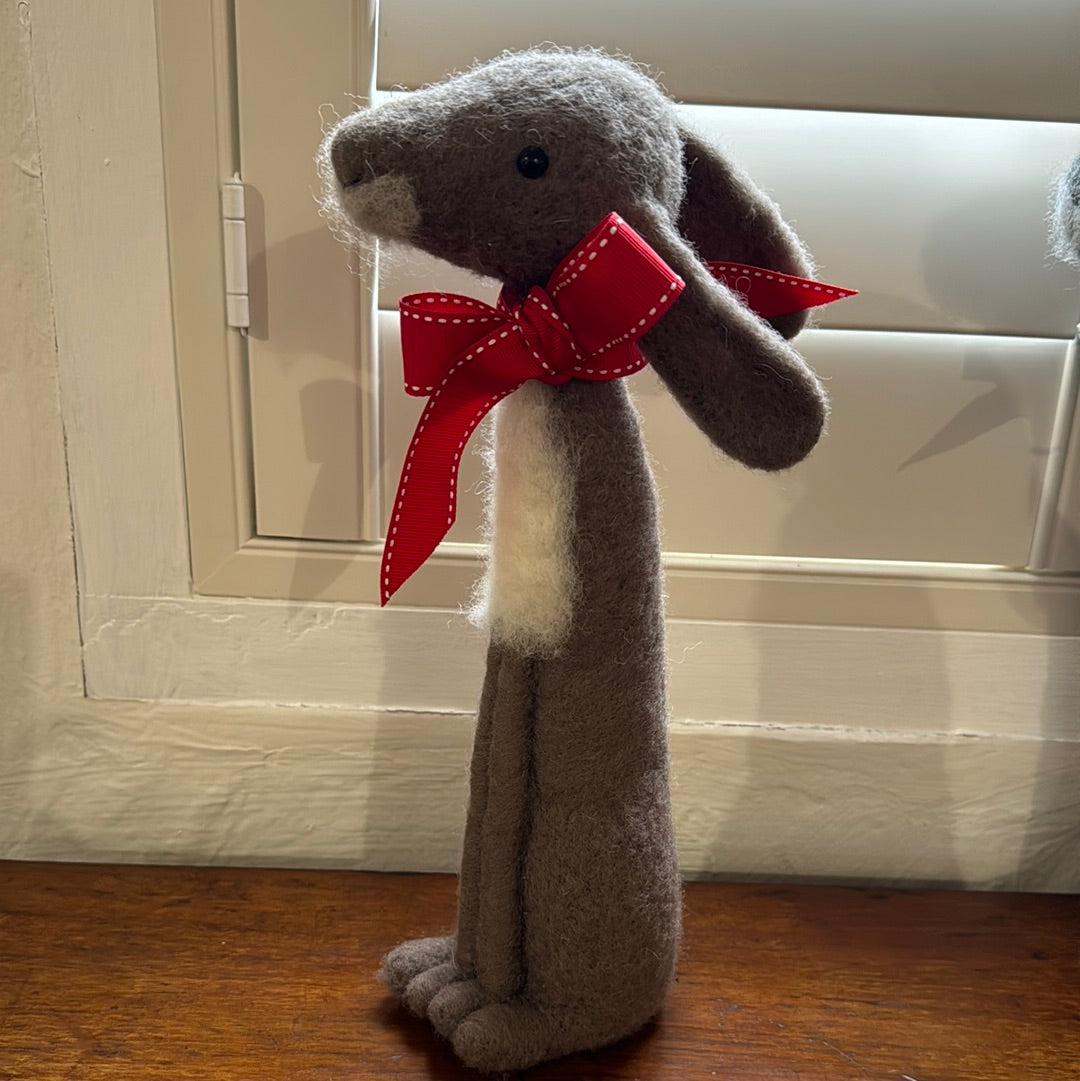 Handmade felt hare using 100% wool and tiny glass beads for eyes. This is not safe for small children to play with - therefore is not a toy.