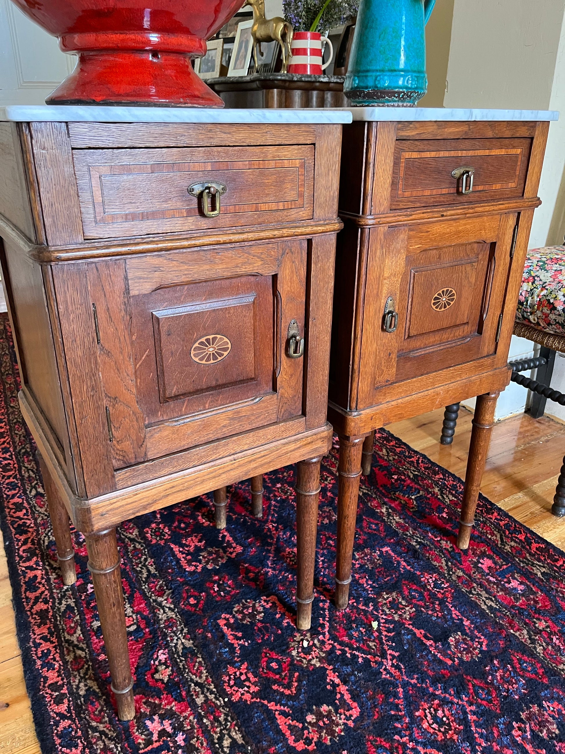 Absolutely stunning antique French oak bedsides or side tables in immaculate condition. They have Italian marble tops which are also in immaculate condition. You will never get ring marks from your hot cup of tea or coffee again! There are drawers under the marble and cupboards below to stow away books, reading glasses, unsightly tissue boxes etc. Beautiful and unusual inlay to the doors. Add a touch of elegance to your home with these beauties.