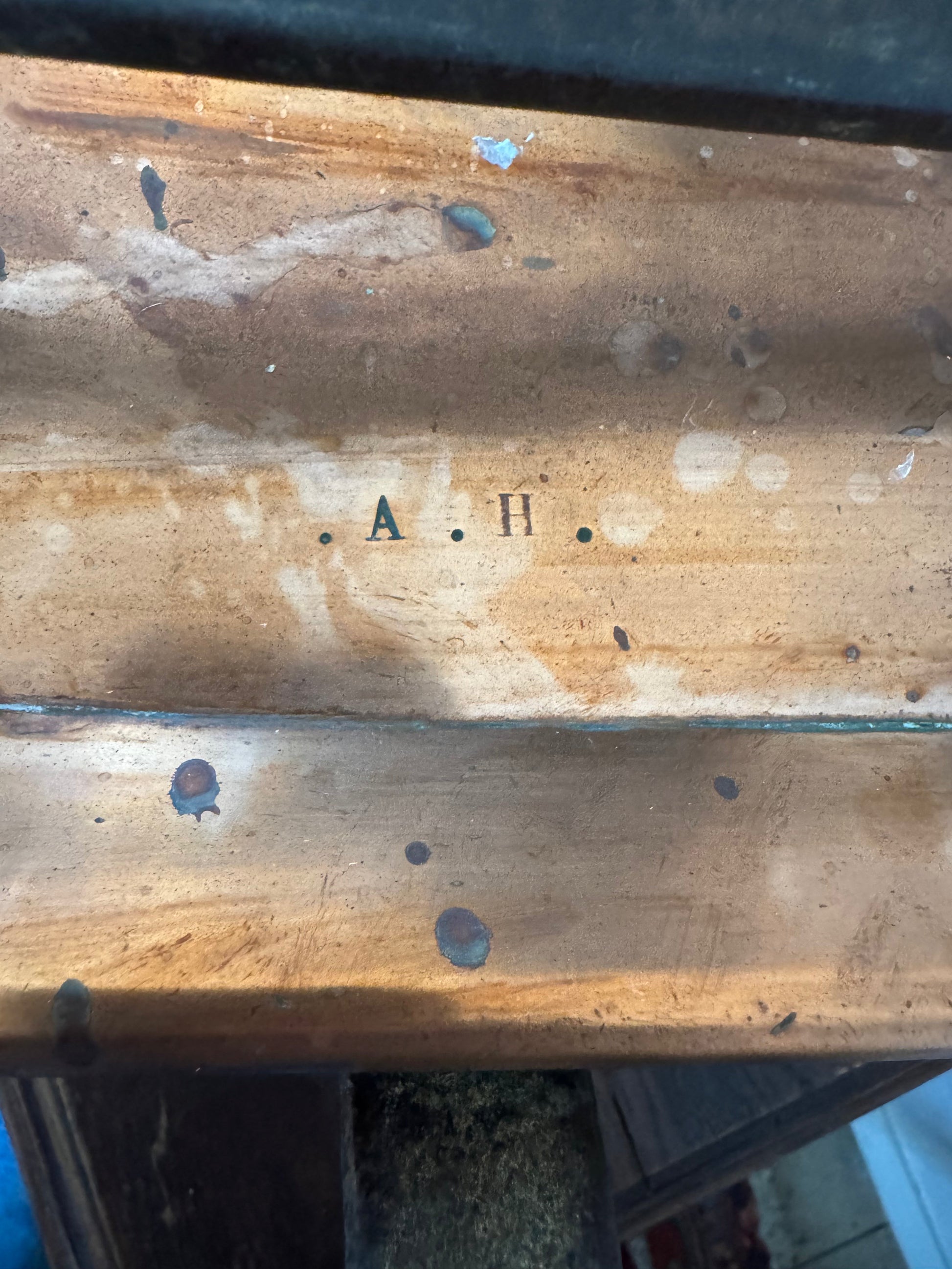 Beautiful old French copper roasting dish. Engraved with the initials A.H. A one of a king piece for your kitchen or collection. Unique French piece that would make a great present for someone that is hard to buy for.