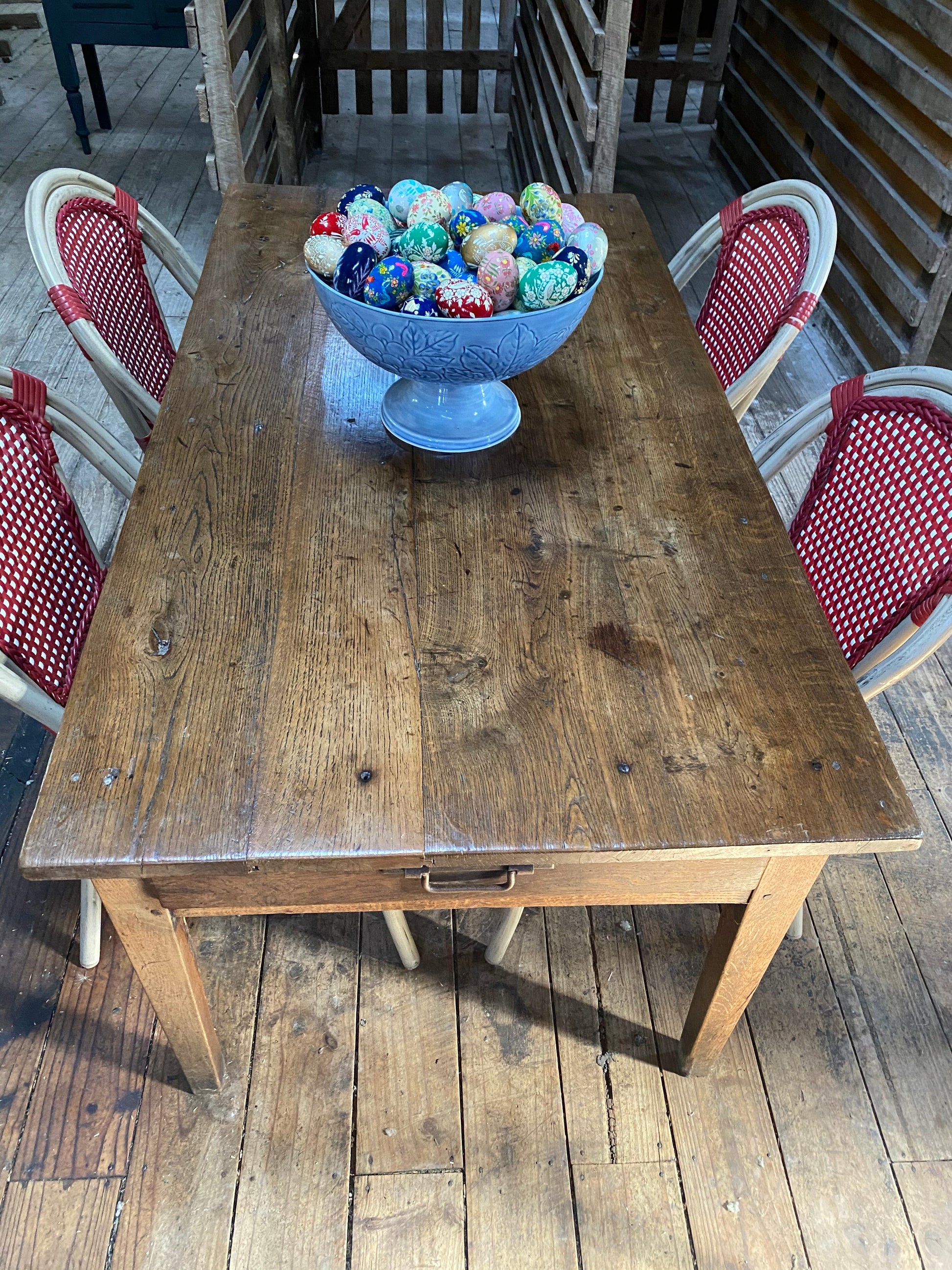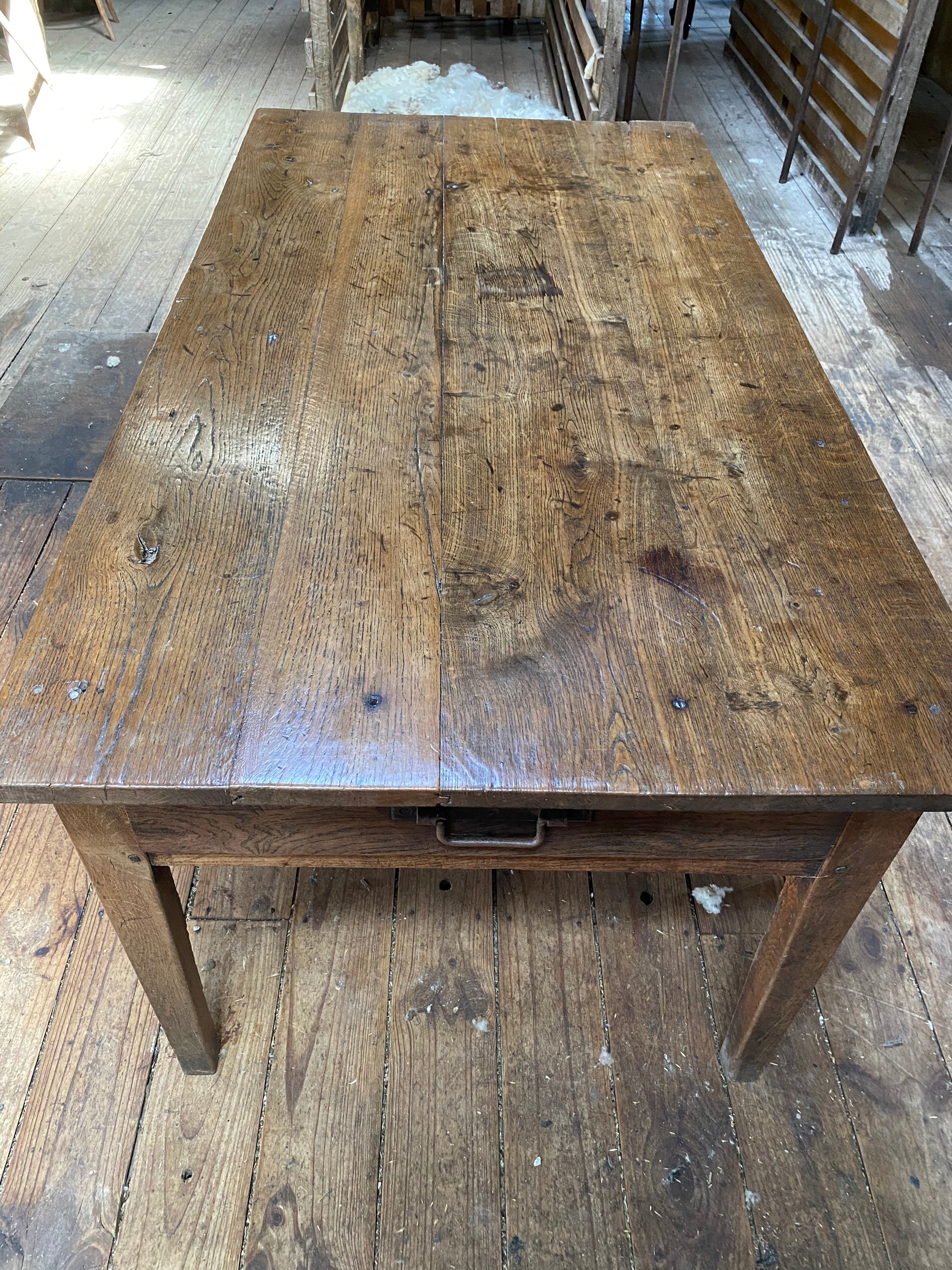 Stunning antique oak French Farmhouse, six seater table with two large cutlery drawers, one at the side and one on the end. This table has so much charm and the patina is sensational. It would suit anyone looking for a smaller table and it would double as a side table, a desk or an entry table. Imported from France and polished with beeswax all ready to go!