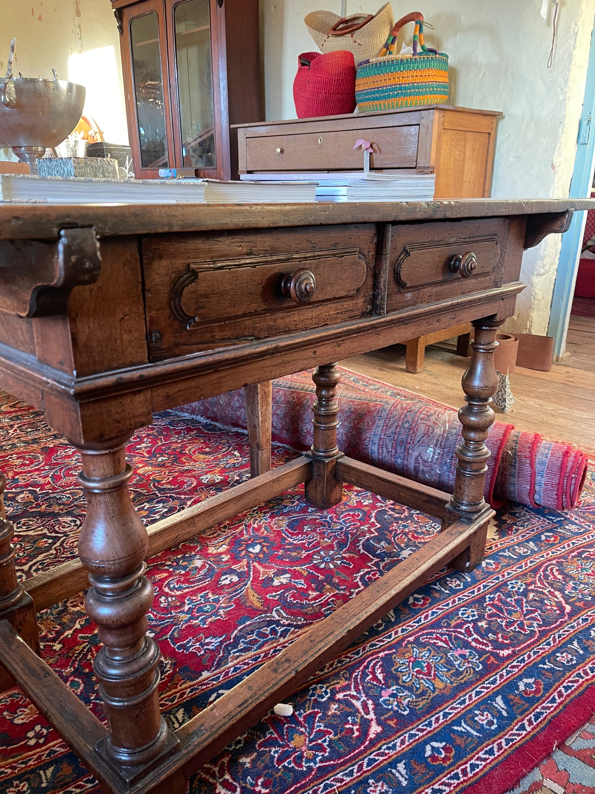 Magnificent French oak table - would look incredible in an entry, a hallway, as a bar in a dining room or between twin beds. It has a gorgeous, time worn patina and two generous drawers to store things in. These pieces never last long as they are so unique and are imported from France, so you will never find another one like it.