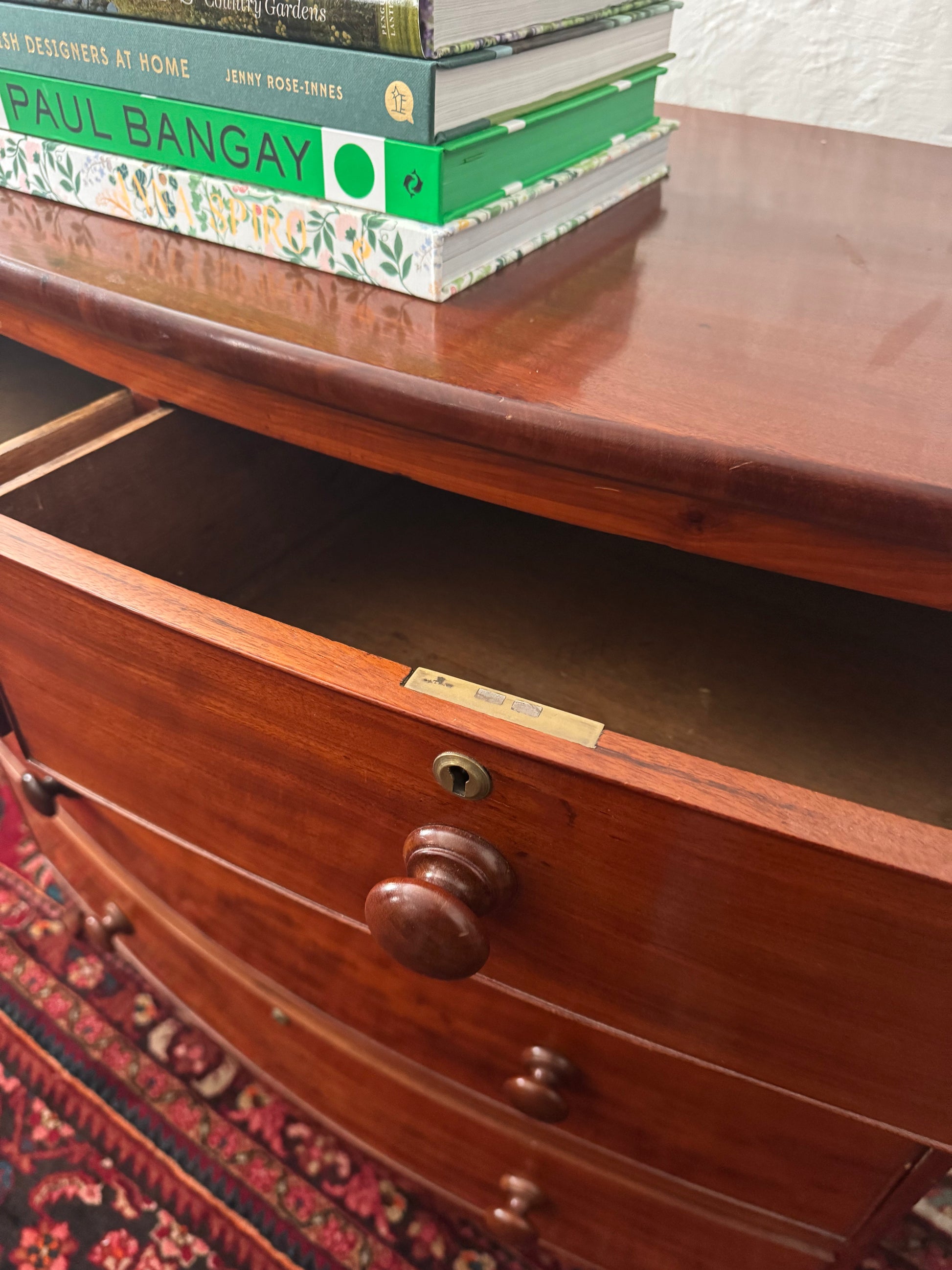Absolutely stunning Georgian bow front chest of five full width drawers, of graduating depth, in immaculate condition. Raised on elegant splayed legs with turned knobs and brass escutcheons. The drawers all open and close with ease and there are no cracks or blemishes to the mahogany. A gorgeous piece of furniture that will be a real stand out in any room.