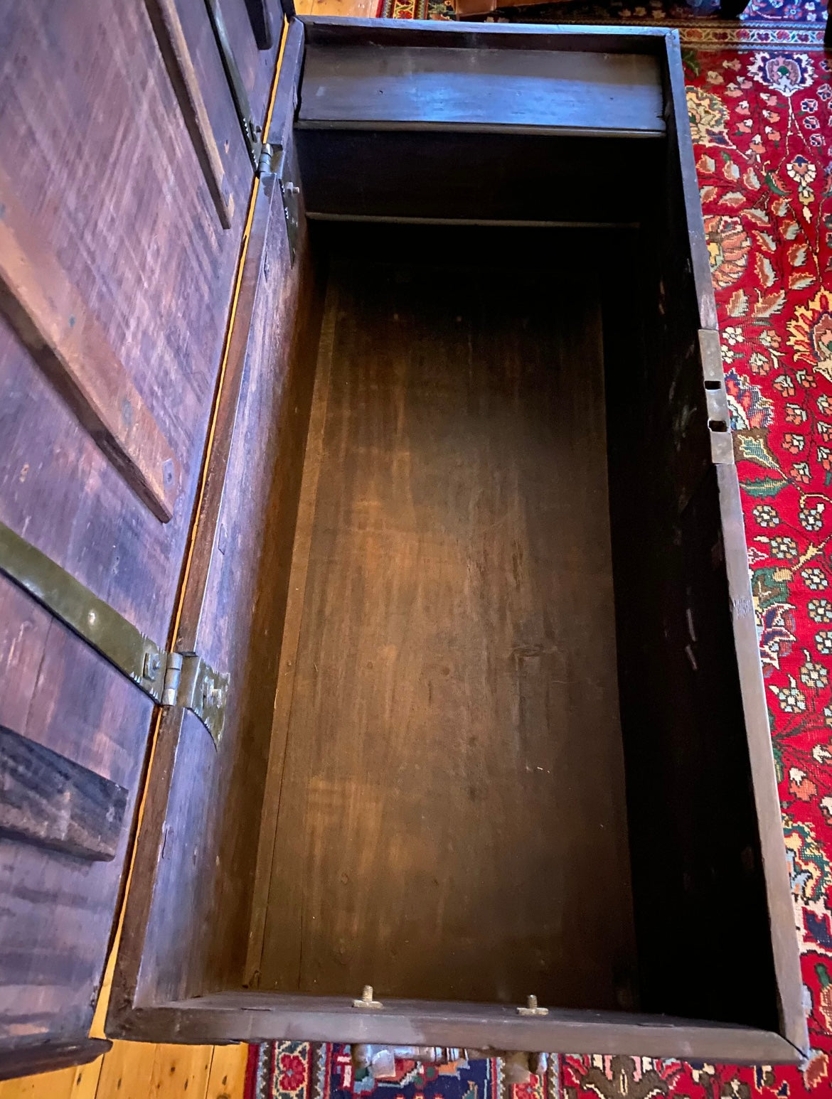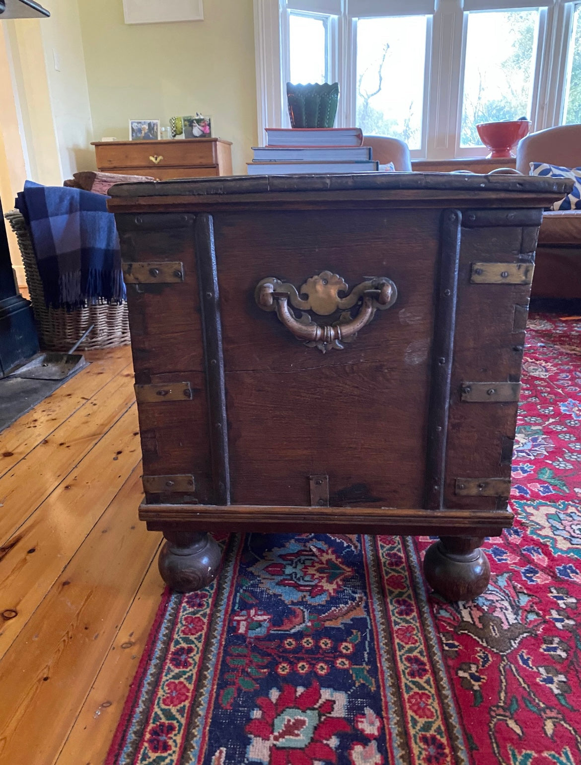 Enormous 18th century Georgian brass bound chest circa 1760. This magnificent over sized chest or trunk is sure to make a statement in any room. It is in excellent condition and weighs a tonne. Needs two people to move.