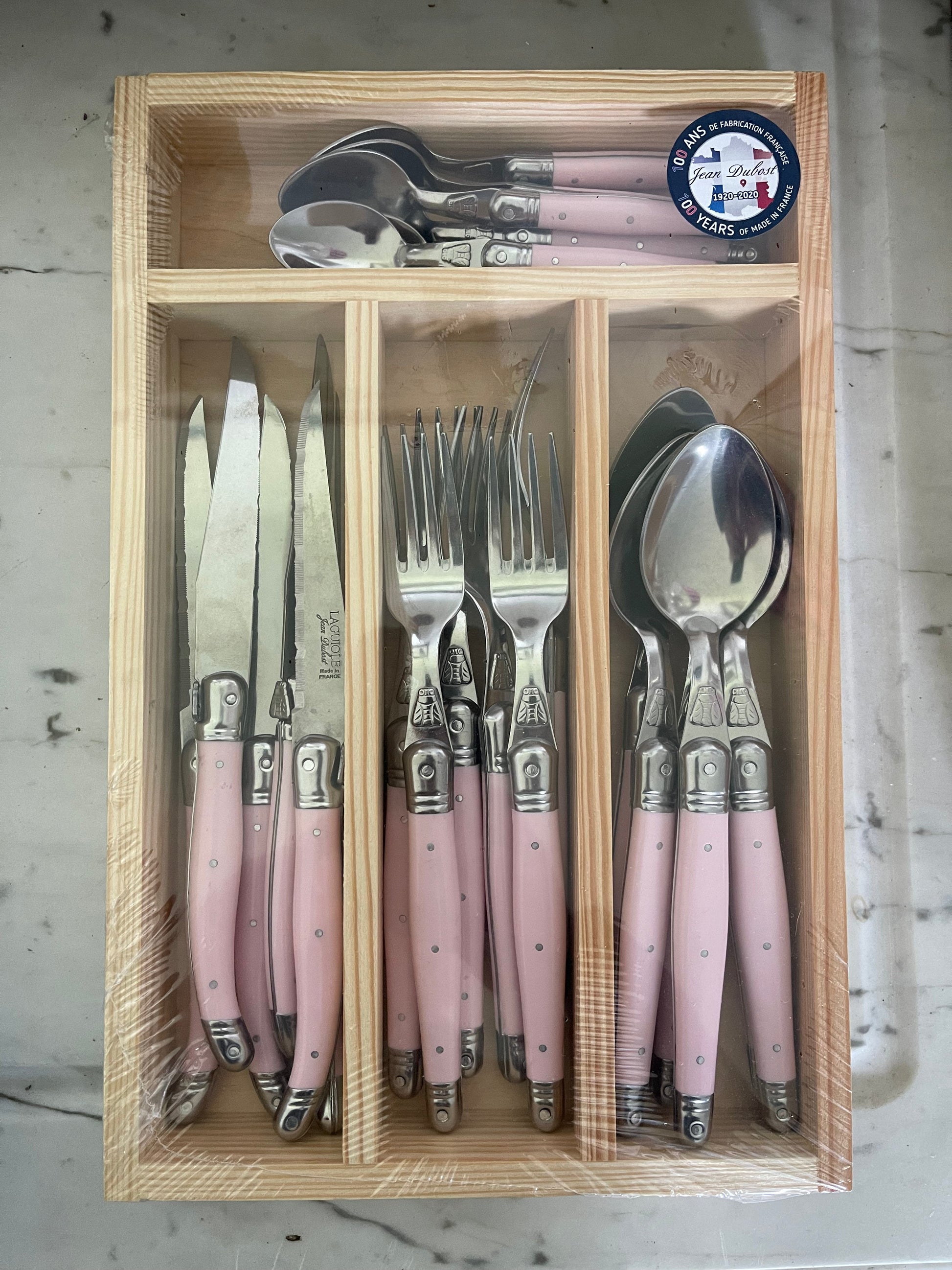 Stunning French cuttlery in pale pink. Pretty bee motif on each piece. Make a statement at your next luncheon or dinner party with this high end, quality cutlery.