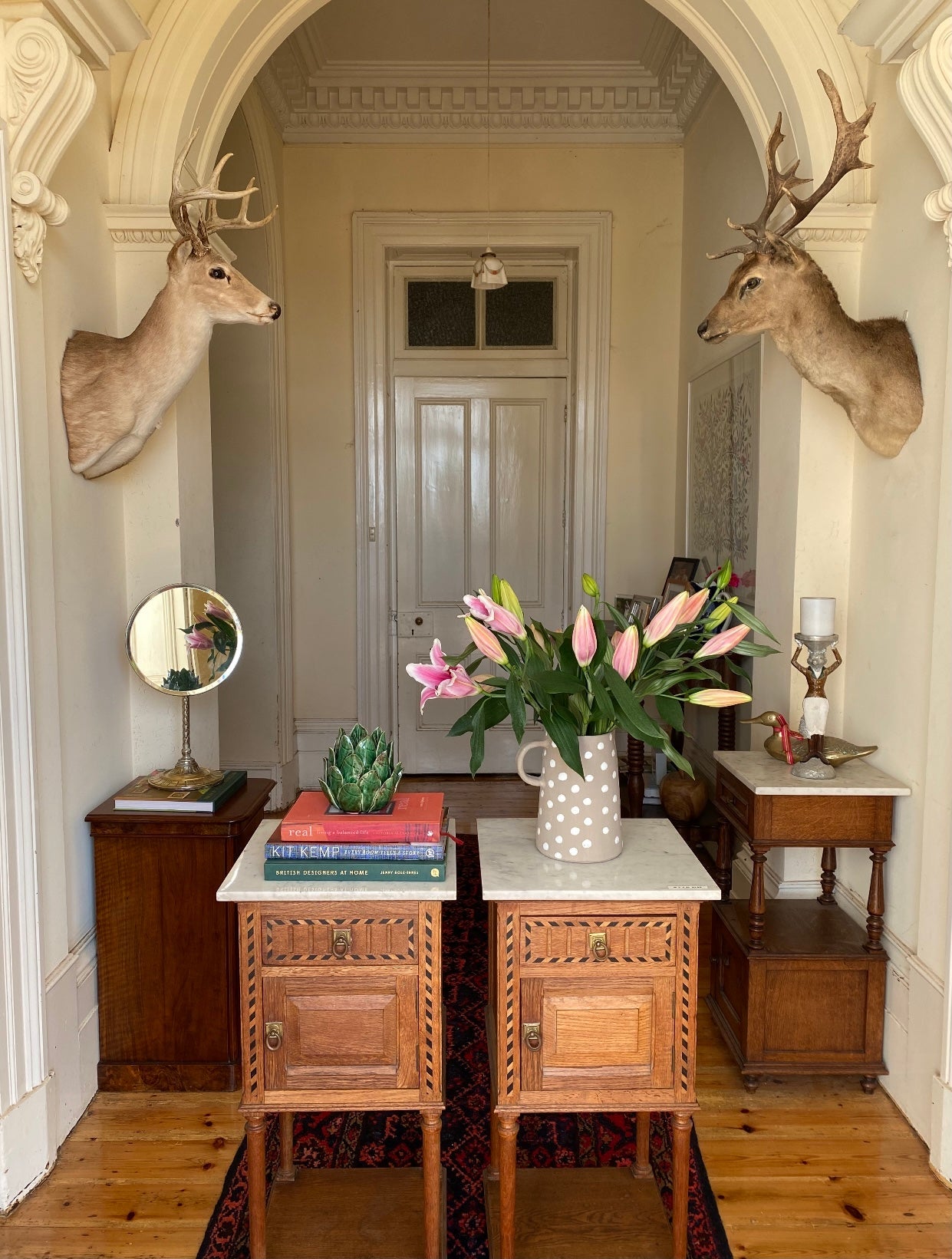 A pair of French oak, marble topped nouveau bedside tables with a very unique inlay. The oak is in excellent condition for its age as is the marble. A few bumps and scratches but nothing too dire. Beautiful matching antique bedsides are very hard to come by. Like hen’s teeth really! These have been recently imported from France and are all ready for their “forever home”.