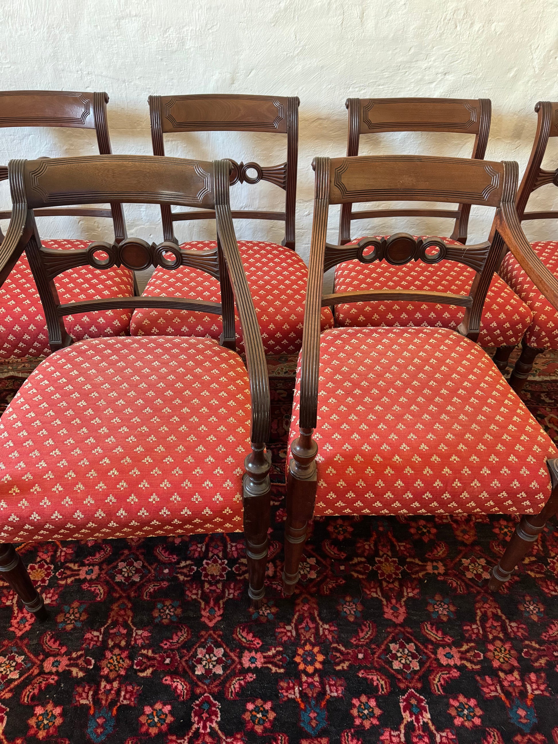 Stunning set of six Georgian style mahogany chairs in excellent condition. Four chairs and two carvers with stunning red and cream upholstery.Β