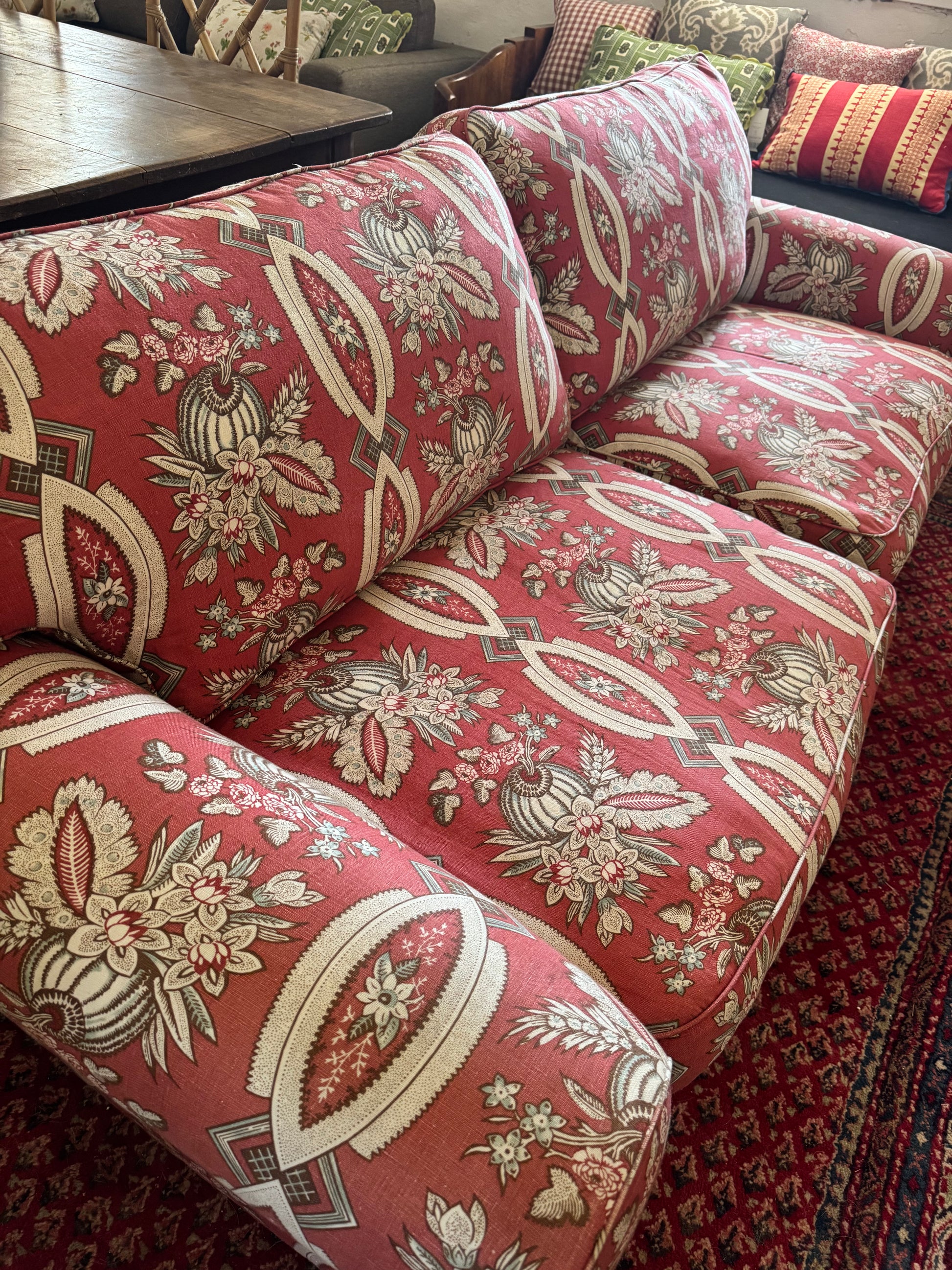 Absolutely stunning sofa, custom made and upholstered in high end fabric. Deep, comfortable, feather filled cushions make this sofa a hard one to get out of! The perfect addition to any living room, office or sunroom.